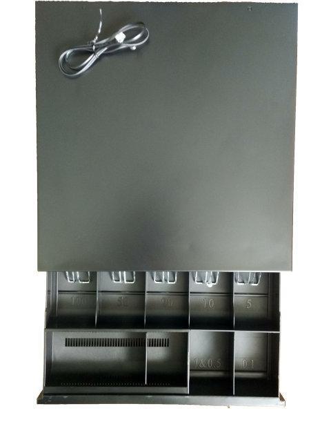 - Надійний сталевий корпус із порошковим забарвленням чорного кольору, лотки для грошей і монет виготовлені з пластику ABS. Також є приховане відділення для зберігання чеків, накладних та інших документів.